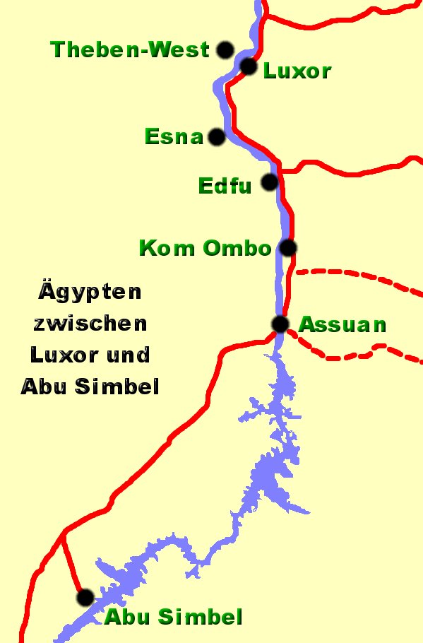 Die Fahrt Was für eine Nacht, am Abend spät ins Bett gefallen und nun schon um zwei Uhr aufstehen. Aber wir wollten es ja nicht anders. Draußen war es noch stockfinster und das Frühstück wollte so früh Morgens auch noch nicht so recht schmecken, es gab nämlich so früh noch gar keines. Was wollten wir eigentlich mitnehmen auf die lange Busreise? Es war garnicht so einfach noch völlig verschlafen unsere sieben Sachen zusammen zu suchen. Im Hotel war es völlig still, als wir den Gang zu Aufzug entlang gingen. Unten in der Hotelhalle war das schon völlig anders, einige der Ausflügler standen schon herum und unterhielten sich. Der Reiseleiter teilte uns mit, die Busse wären am Festland schon da und wir könnte schon mal rüberfahren. Auch eine interessante Erfahrung, den Nil in fast stockfinsterer Nacht in einem kleinen Boot ohne Beleuchtung zu überqueren. Nur gut, daß es um diese Zeit noch keinen so starken Verkehr auf dem Wasser gibt. Bis der Rest der Leute da war, hatte wir reichlich Gelegenheit, müde ins dunkle Wasser zu starren und unseren Träumen über das prunkvolle Leben der Pharaonen nachzuhängen.