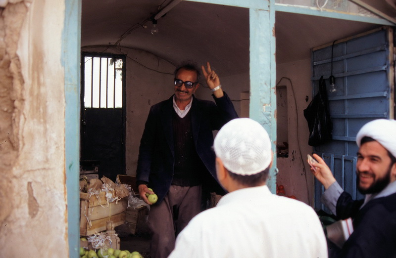Als wir den offiziellen Besichtigungsteilabgeschlossen hatten, konnten wir uns doch noch umsehen. Wir lösten uns in kleine Gruppen auf und verstreuten uns. Einige der Damen besorgten sich im Basar noch einen Tschador, da sie von zu Hause die falsche Kleidung mitgebracht hatten. Ich ging mit Ernst auch erst mal zum Basar. Und weil wir ja in einer Pilgerstadt waren, kaufte ich mir eine Pilgerkappe, ein aus schwarzer Wolle gestrickes Mützchen. Die war garnicht schlecht, sie schütze vor allzu großer Sonnenstrahlung. Wir gingen weiter Richtung Wohngebiete, und kauften uns an einem Obststand ein paar Orangen. Da standen auch ein paar Iraner und zwei Mullahs. Wir benahmen uns ganz artig und grüßten mit einem freundlichen 'Salam'. Das wurde erwidert und sogleich kam die Frage, wo wir denn her kommen. Als wir sagten, wir sind aus 'Almani', Deutschland, erlebten wir eine Überraschung. "Ahh, Almani, gut, Almani gut" und dann wollten sie, daß wir sie gleich fotografieren.