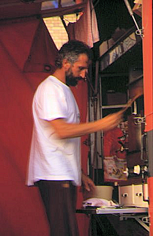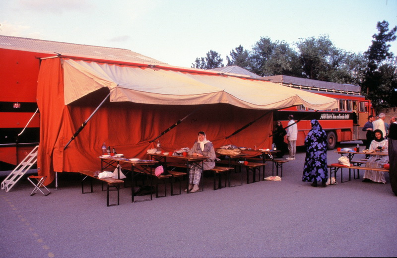 Die Küche ist an der Rückseite des Zugfahrzeuges eingerichtet. Die komplette Rückwand des Busses läßt sich öffnen und dahinter verbirgt sich eine ganze Großküche. Man glaubt garnicht, wie gut die Gerichte schmeckten, die unser Fahrer, der Gerhard, so gekocht hat. Während wir auf Besichtigungstour waren, hat der am Markt oder in Geschäften die Zutaten gekauft und gekocht. An einem Tag wollten die weiblichen Mitreisenden unseren Fahrer entlasten und boten an, für alle zu kochen. Der Versuch war lobenswert, aber geschmeckt hat´s nicht. Kein Wunder, Gerhard weiß welche Mengen er braucht und wie er für 40 Leute würzen muß, daß es schmeckt, wer aber in der Regel nur für ein bis vier Personen kocht, hat für solche Mengen kein Gespür.