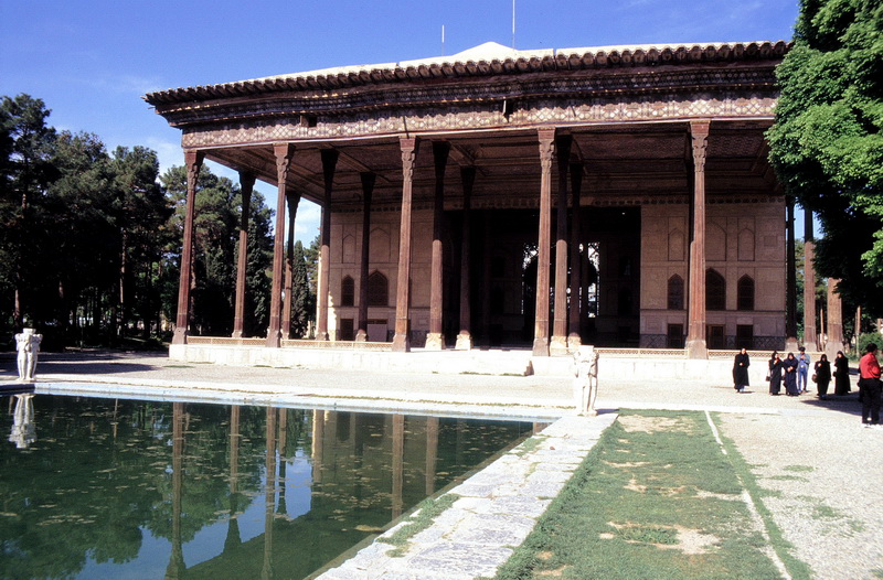 Nach dem Genuß der kühlen Morgenluft am Fluß führen wir wieder in die historische Altstadt. Ausgangspunkt war der Königsplatz (Meydan-e Emam), der mit 512x160m einer der größten umbauten Plätze der Welt ist. Der Platz wird auch in Buch 'Der Medicus' beschrieben, dort findet der Langstreckenlauf statt und es wurde Polo gespielt. Rund um den Platz sind die wichtigsten Sehenswürdigkeiten leicht zu erreichen. Wir gehen aber erst durch ein Tor an der Südwestseite aus dem Platz hinaus. Nach einem kurzen Stück Weg erreichten wir den Chehel Sotun Garten mit dem 'Chehel Sotun', dem 40-Säulen-Palast. Eigentlich hat das Bauwerk nur 20 Säulen, aber durch die Spiegelung im Teich davor werden es eben 40. Gebaut wurde es 1647 von Shah Abbas II.