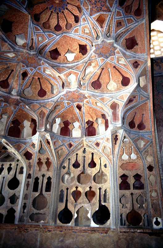 Zurück zum Meydan-e Emam besuchten wir einen zweiten Palast, den Ali Qapu Palast (Hohe Pforte). Es ist der repräsentative Zugang zur Palastanlage, die sich von hier nach Südwesten erstreckte. Der fünfstöckige Palast wurde von den Timuriden erbaut und unter Shah Abbas Ende des 16. Jahrhunderts zum Regierungssitz umgebaut. Im Palast gibt es sogar kleine Kamine für den Winter. Reza Abbasi, ein gefeierter Miniaturmaler der Safaviden verzierte die Wände mit schönen Malereien. Auf der Terasse des Palastes konnte man bei angenehmen Temperaturen das Geschehen auf dem großen Platz verfolgen. Im Hauptsaal kann man eine besondere Art der Wandverzierung bewundern. In einigem Abstand vor der eigentlichen Wand wurde eine zusätzliche Gipsverschalung angebracht, aus der Teile ausgeschnitten wurden. Dadurch ergeben sich viele kleine Nischen, die wie Flaschen geformt sind. Darin standen wahrscheinlich Flacons und andere Glas- oder Metallgefäße. Zusätzlich wirkten die Nischen wie ein akkustischer Verstärker, warum der Raum auch Musikzimmer genannt wird.