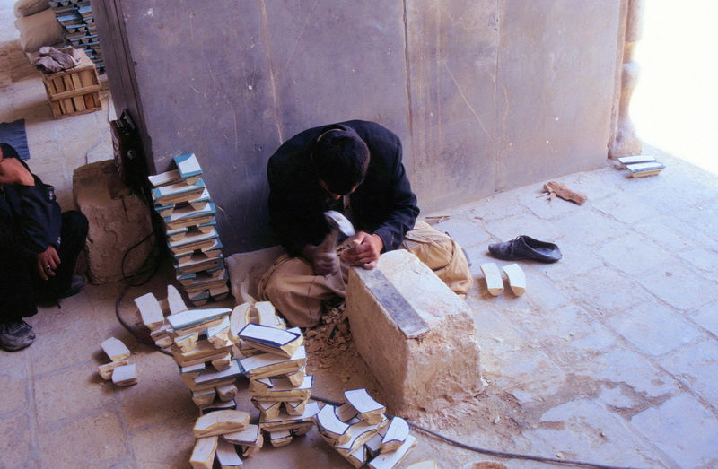 Die einzelnen kleinen Fliesenteile werden nach Vorlage aus größeren Platten exakt herausgearbeitet und erst einmal trocken zusammengesetzt. Wenn alles paßt werden sie mit der Farbseite nach unten in die Negativ-Form gelegt und mit Gips bestichen, daß die einzelnen Teile nicht mehr auseinanderfallen. Ist so ein Segment der Kuppel vollständig, wird dieses wieder in mehrere Einzelteile zerlegt, die transpotierbar sind, schließlich muß der Arbeiter in luftiger Höhe ohne größere technische Hilfsmittel arbeiten. Die einzelnen Teile werden auf die Kuppel hinauf transportiert und dort an der Kuppel befestigt. Ich muß es hier nochmals betonen, die Bauwerke sind nicht bemalt, sondern aus tausenden von Einzelteilen wie ein Mosaik zusammengesetzt. Die Handwerker sitzen mit eigentlich viel zu großen Hämmern da uns schlagen von größeren glasierten Fliesen kleine Teile ab, die dann noch passgenau mit eben diesen großen Hämmern bearbeitet werden.