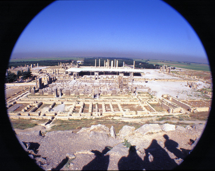 In den steilen Hängen hinter den Palstanlagen gelangt man nach reichlich schweißtreibendem Aufstieg zu den Grabkammern von Artaxerxes II. und Artaxerxes III. Die aus dem Felsen gehauenen Grabkammern bergen keine Überraschung, im Inneren sind weder Reliefs noch Bemalung zu erkennen. Die Außenseite dagegen ist wiederum mit den Abbildungen der Leibgarden, den 10.000 Unsterblichen versehen. Nachdem wir unseren Rundgang in der Gruppe beendet hatten, sind wir nochmal zu zweit zu den Gräbern hinaufgestiegen. Zu Anfang waren wir völlig alleine und wir genossen den Blick auf die Ebene. Zwischen Bäumen kann man noch immer die Zeltstadt sehen, die der letzte Shah errichten lies. Hier wurde mit unermesslichem Prunk die 2.500 Jahrfeier des Iran abgehalten. Die Zelte kann man derzeit aber nicht besichtigen. Wir wollten schon wieder hinunter, als eine Gruppe junger Leute den Berg heraufkam. Eigentlich war es nicht anders zu erwarten, sofort kamen sie zu uns und wollten alles mögliche wissen. Die Jugendlichen konnten gut Englisch und so wurde es ein interessantes Gespräch. Es stellte sich heraus, daß es Studenten aus Shiraz waren, die hier die Geschichte ihrer Vorfahren studierten. Unter den Studenten waren auch einige junge Frauen, die aber getrennt von den Männern die Gräber studierten. Wir unterhielten uns noch einige Zeit, mußten aber dann gehen, da wir uns den Rest von Persepolis anschauen wollten. Wir hatten gerade den ersten Teil der Stufen hinter uns, als die Studenten plötzlich zu klatschen begannen. Wir drehten uns um und da standen sie am Rand der Terasse vor dem Grab und winkten und klatschten uns zu. Einige Zeit später trafen wir nochmal einen der Jugendlichen und wir fragten wieso sie gekltscht hätten. Er sagte, sie hätten sich einfach gefreut, daß sie uns getroffen hätten und daß sich Deutsche für ihre Kultur interessieren. Wieder eine Überraschung, sowas hatten wir noch nie erlebt.